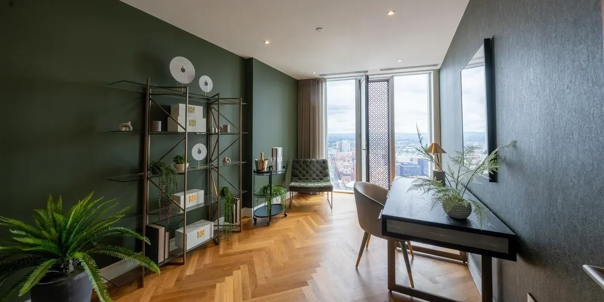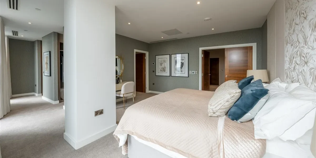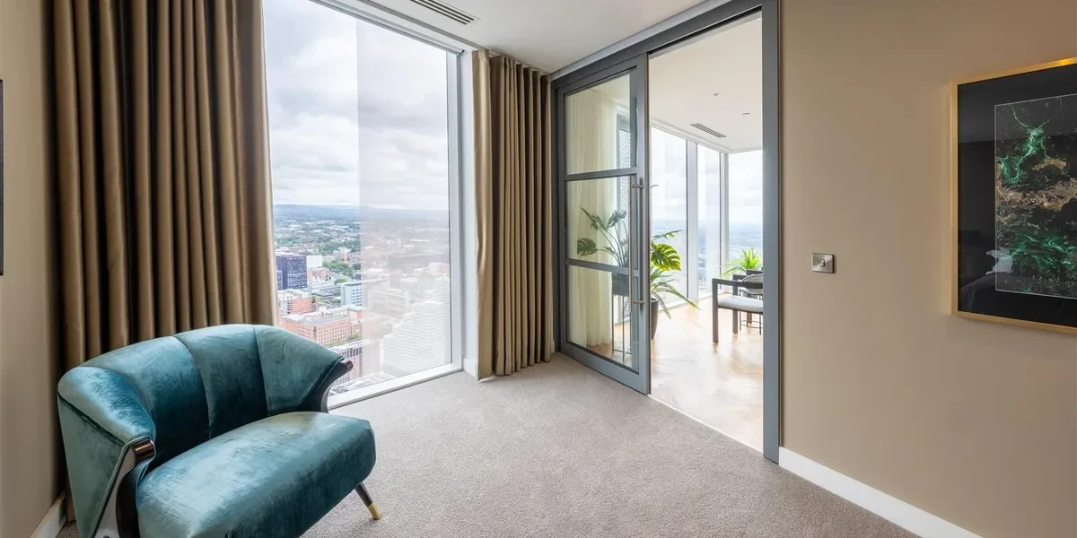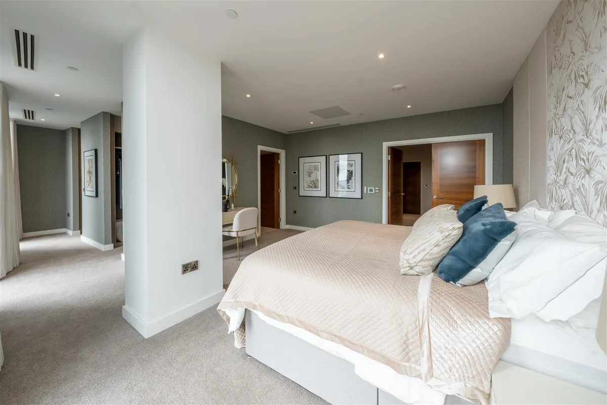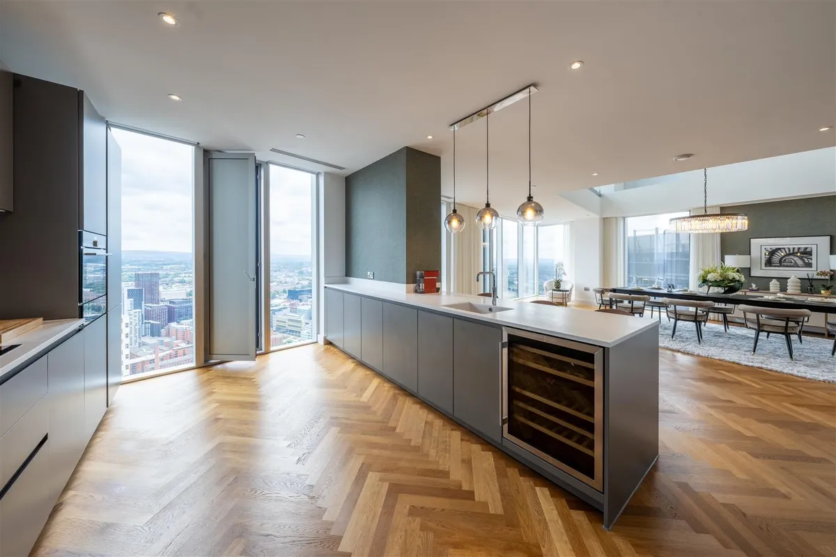 This duplex penthouse occupies the top floors boasting exceptional views of the city centre and beyond. With over 3,100 sq ft of living space, the penthouse comprises three double bedrooms, each with en-suites that are equipped with Duravit sanitary ware. There are three double bedrooms with a dressing area (master bedroom), an open plan living and kitchen area, a viewing gallery, a study, in addition to a separate WC for guests. Throughout the Penthouse, there is cooling/air conditioning, as well as electric dimout blinds, and matching walnut veneer entrance and internal doors. The penthouse has been finished to a truly exquisite standard.