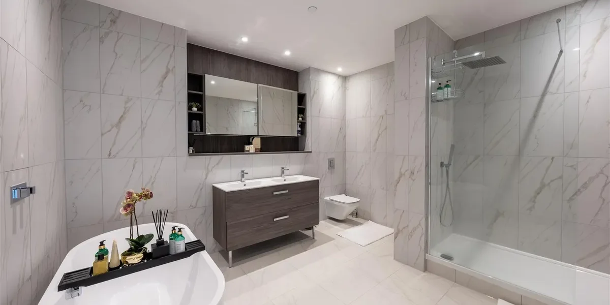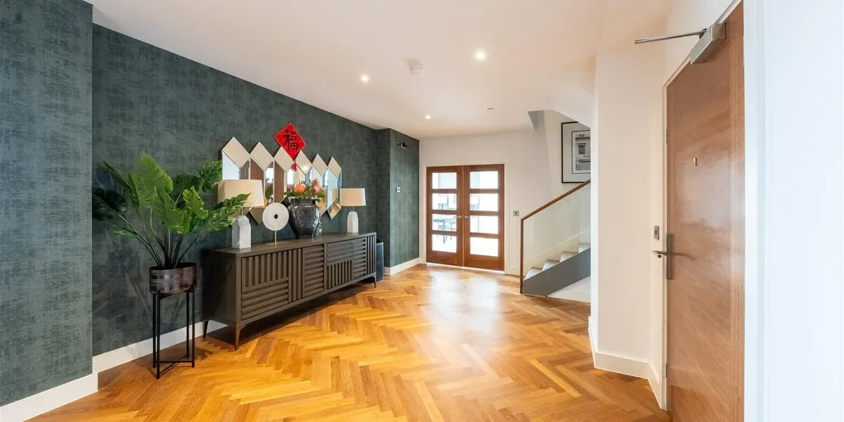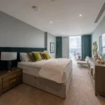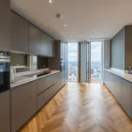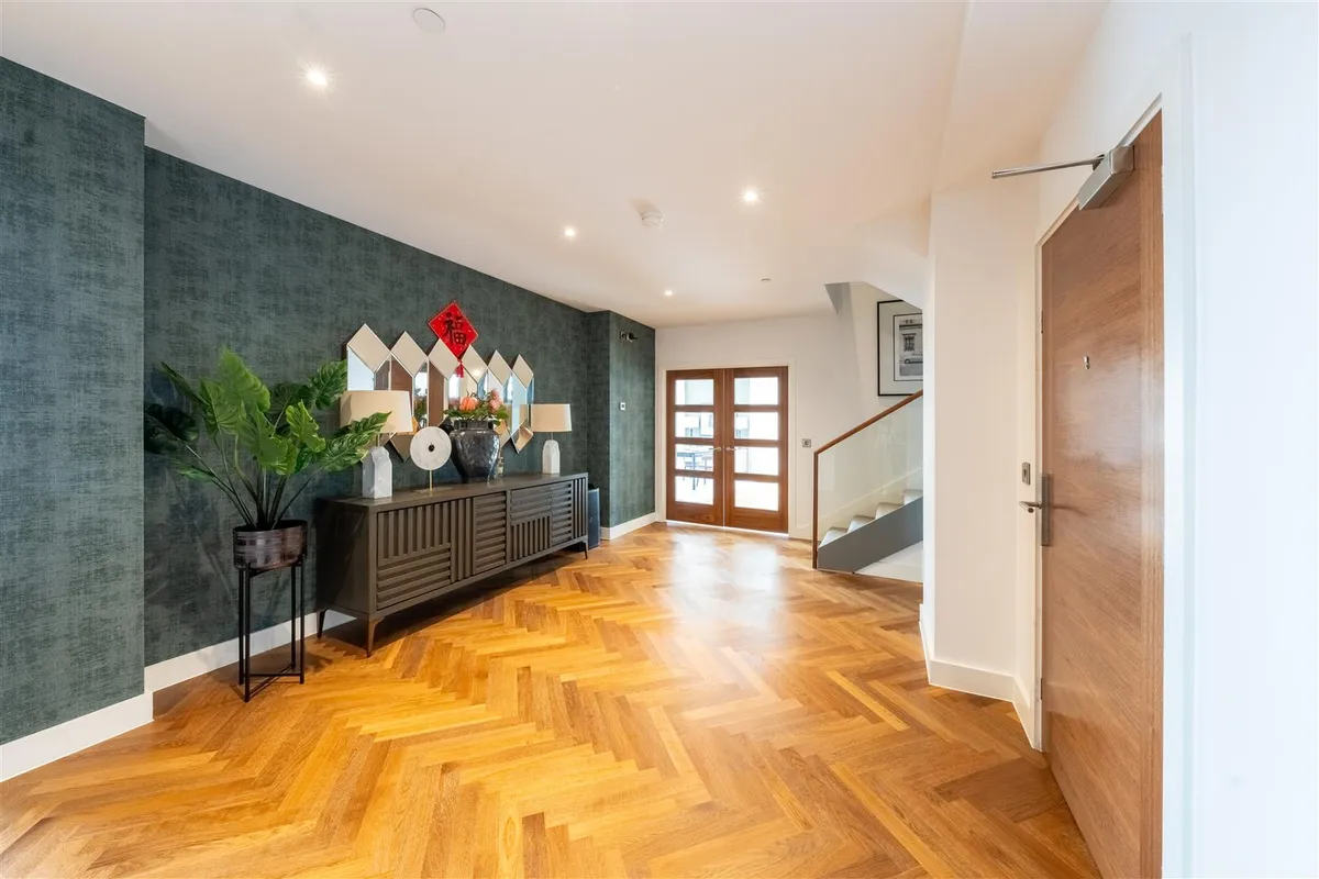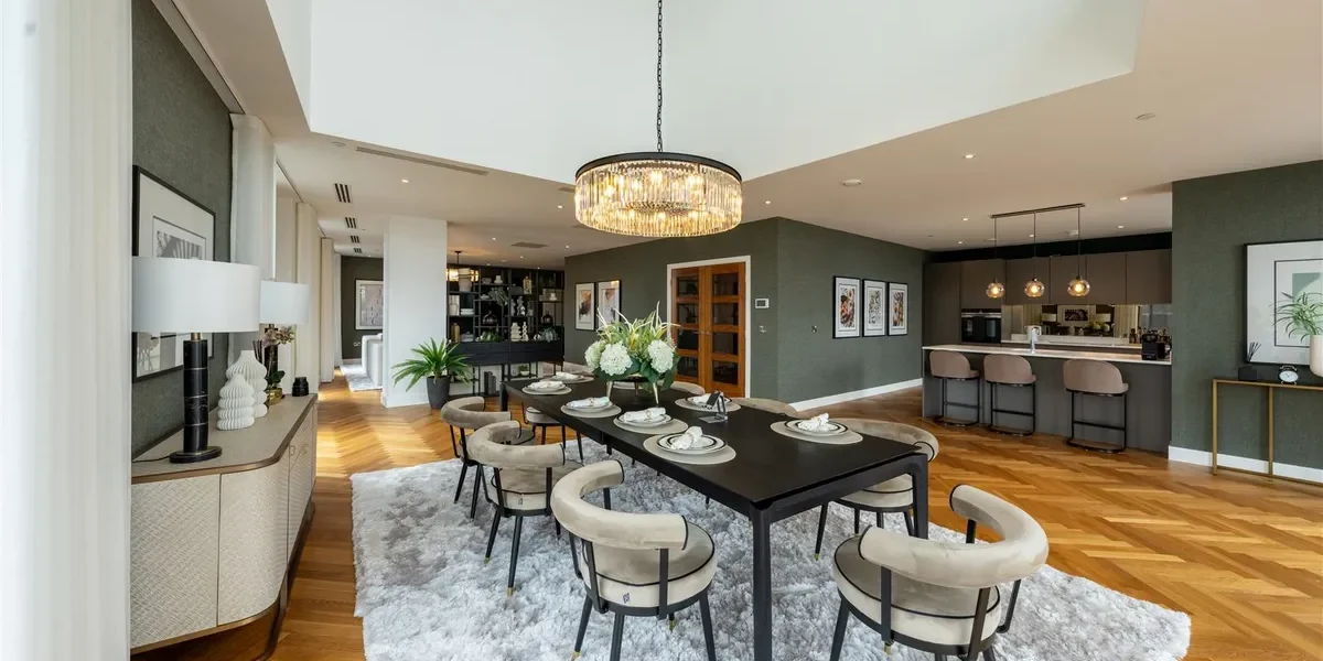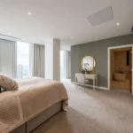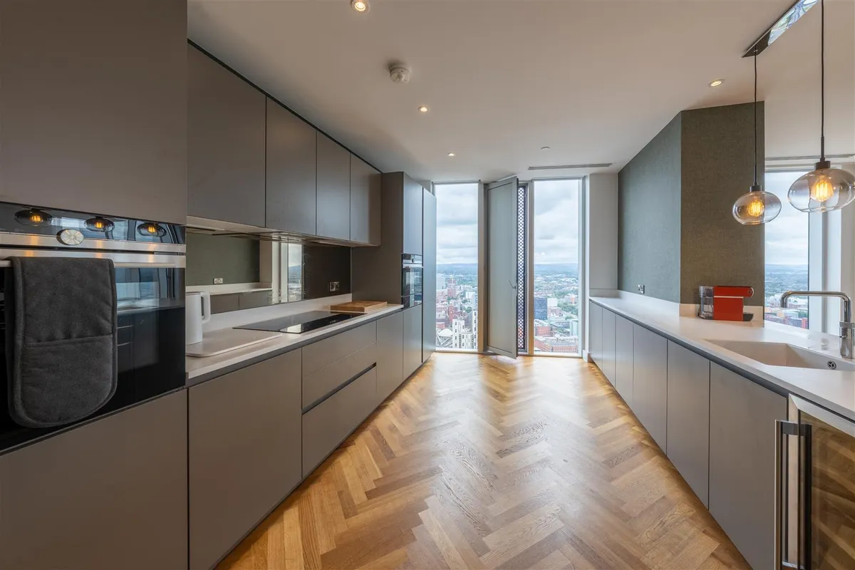 This duplex penthouse occupies the top floors boasting exceptional views of the city centre and beyond. With over 3,100 sq ft of living space, the penthouse comprises three double bedrooms, each with en-suites that are equipped with Duravit sanitary ware. There are three double bedrooms with a dressing area (master bedroom), an open plan living and kitchen area, a viewing gallery, a study, in addition to a separate WC for guests. Throughout the Penthouse, there is cooling/air conditioning, as well as electric dimout blinds, and matching walnut veneer entrance and internal doors. The penthouse has been finished to a truly exquisite standard.