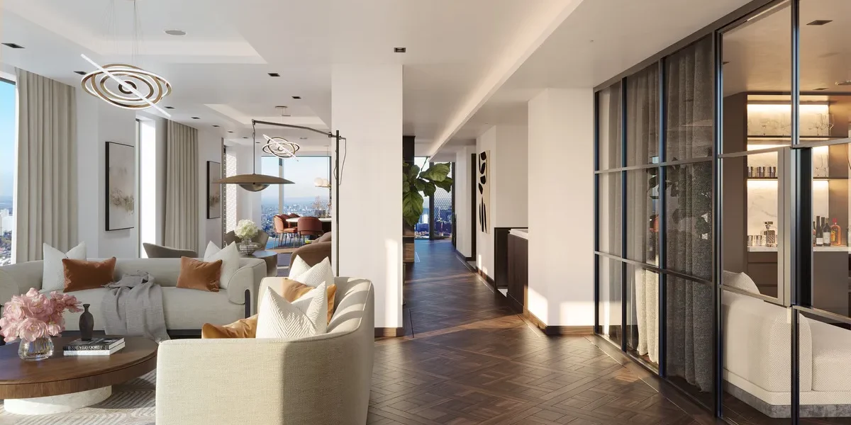 This exceptional two-bedroom penthouse is meticulously designed for refined, contemporary living. The expansive principal suite features a beautifully appointed en-suite bathroom, while a further double bedroom is served by a luxurious main bathroom, finished with high-quality fittings and elegant detailing. At the heart of the residence, the open-plan living and kitchen space creates a seamless environment for both entertaining and everyday comfort. A private in-residence sauna elevates the home to true super-prime status, offering a rare wellness retreat within the privacy of your own apartment, a statement of lifestyle as much as specification. Contemporary high-gloss kitchens with integrated appliances and feature lighting sit alongside elegantly appointed bathrooms with porcelain tiling, mirrored finishes and heated towel rails. The result is a statement residence defined by light, scale and architectural distinction.