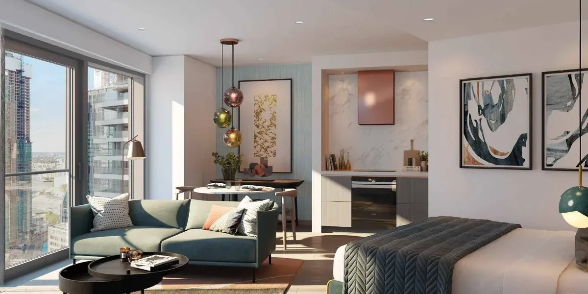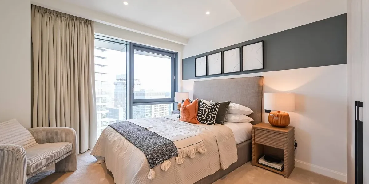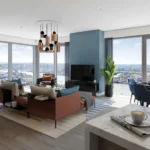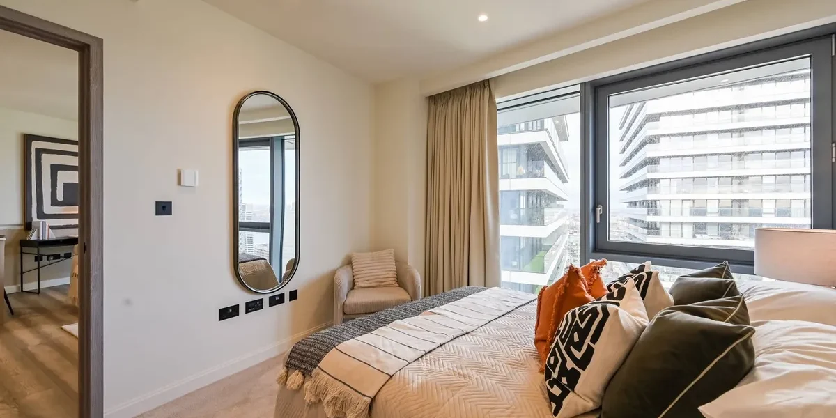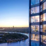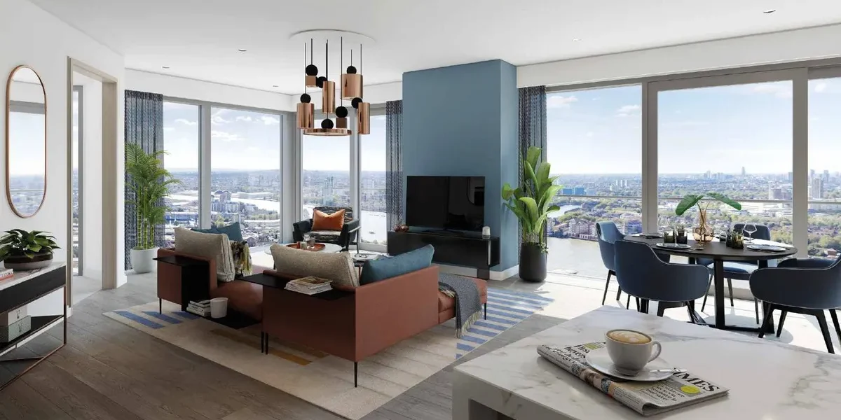 The apartment features a beautifully designed open-plan living and dining area with floor-to-ceiling windows that fill the space with natural light while framing dramatic city views and sunsets. The living space flows seamlessly onto a private balcony, creating the perfect setting for relaxing or entertaining while enjoying the elevated outlook over London.