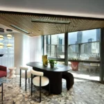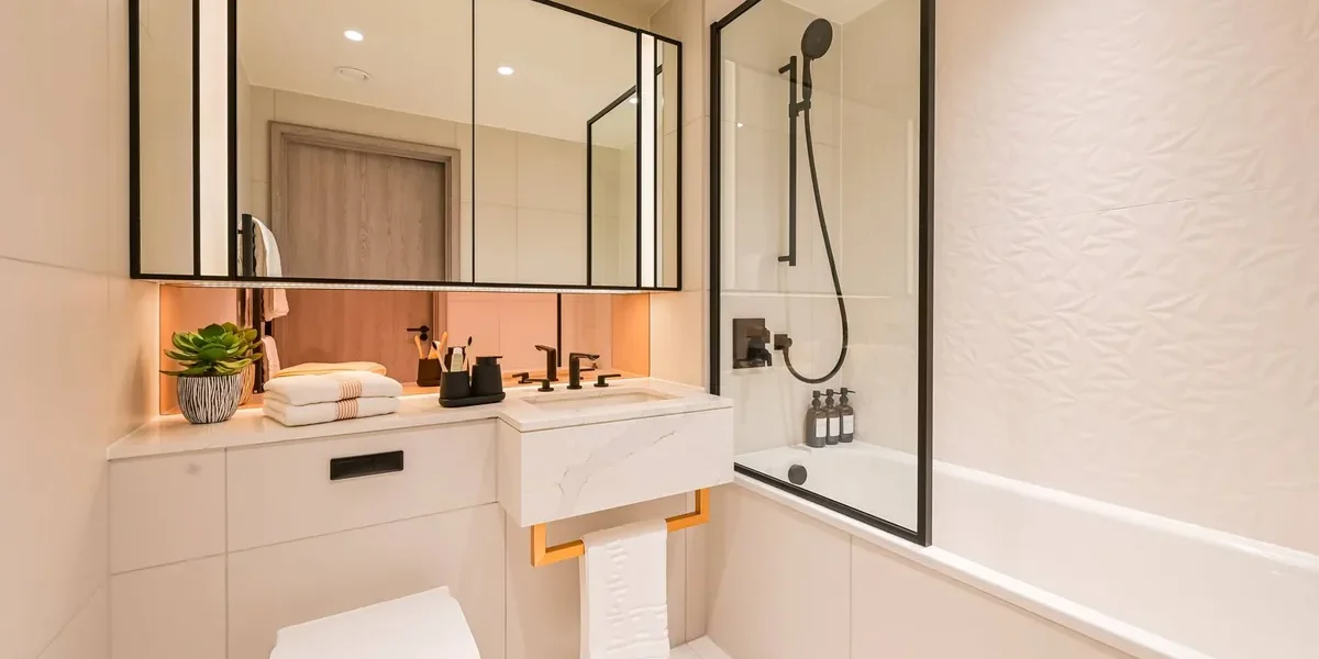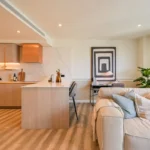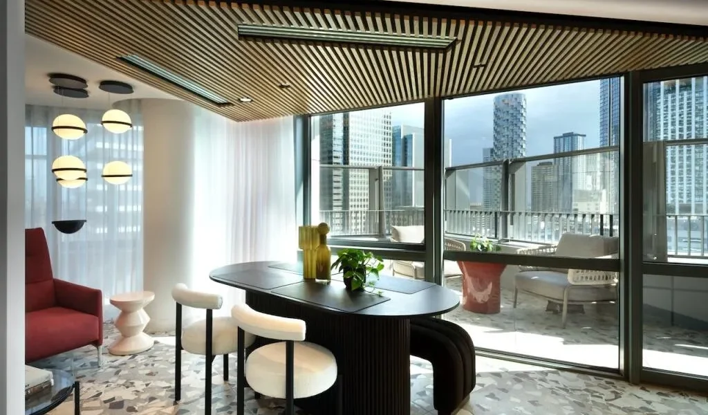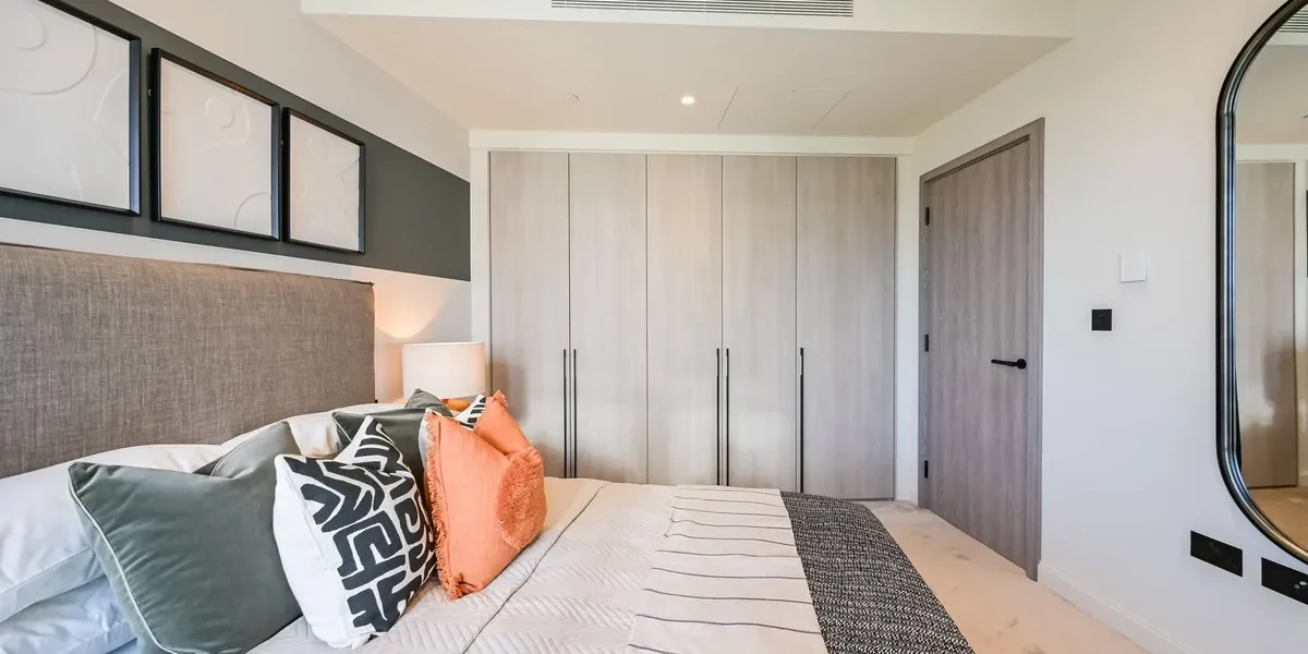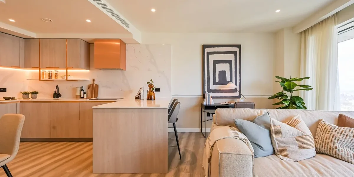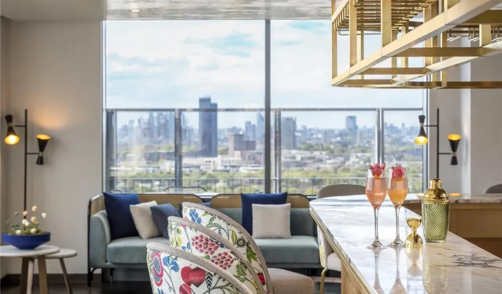 The apartment features a beautifully designed open-plan living and dining area with floor-to-ceiling windows that fill the space with natural light while framing dramatic city views and sunsets. The living space flows seamlessly onto a private balcony, creating the perfect setting for relaxing or entertaining while enjoying the elevated outlook over London.