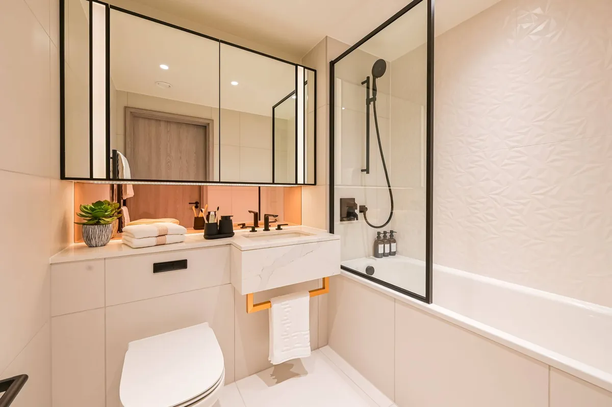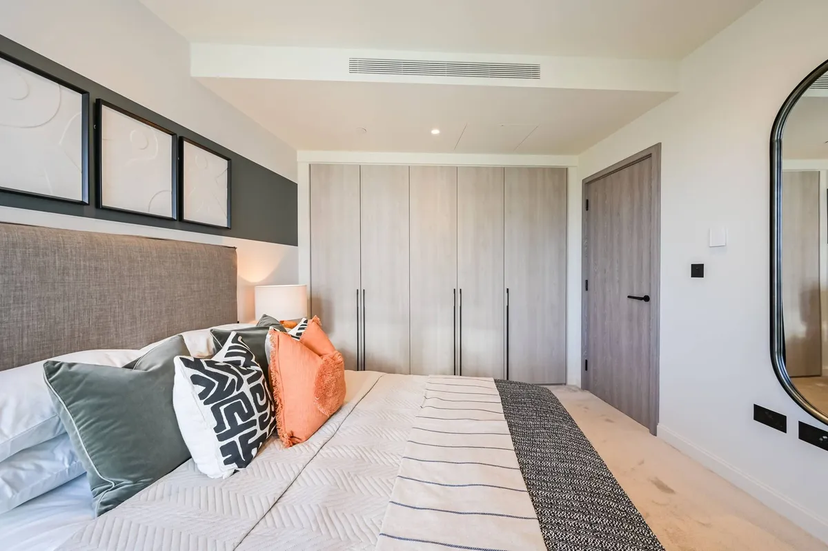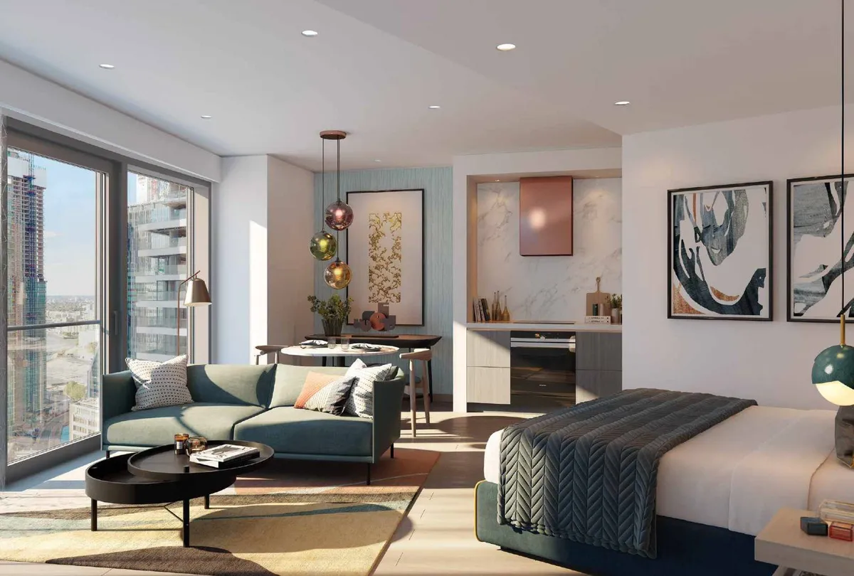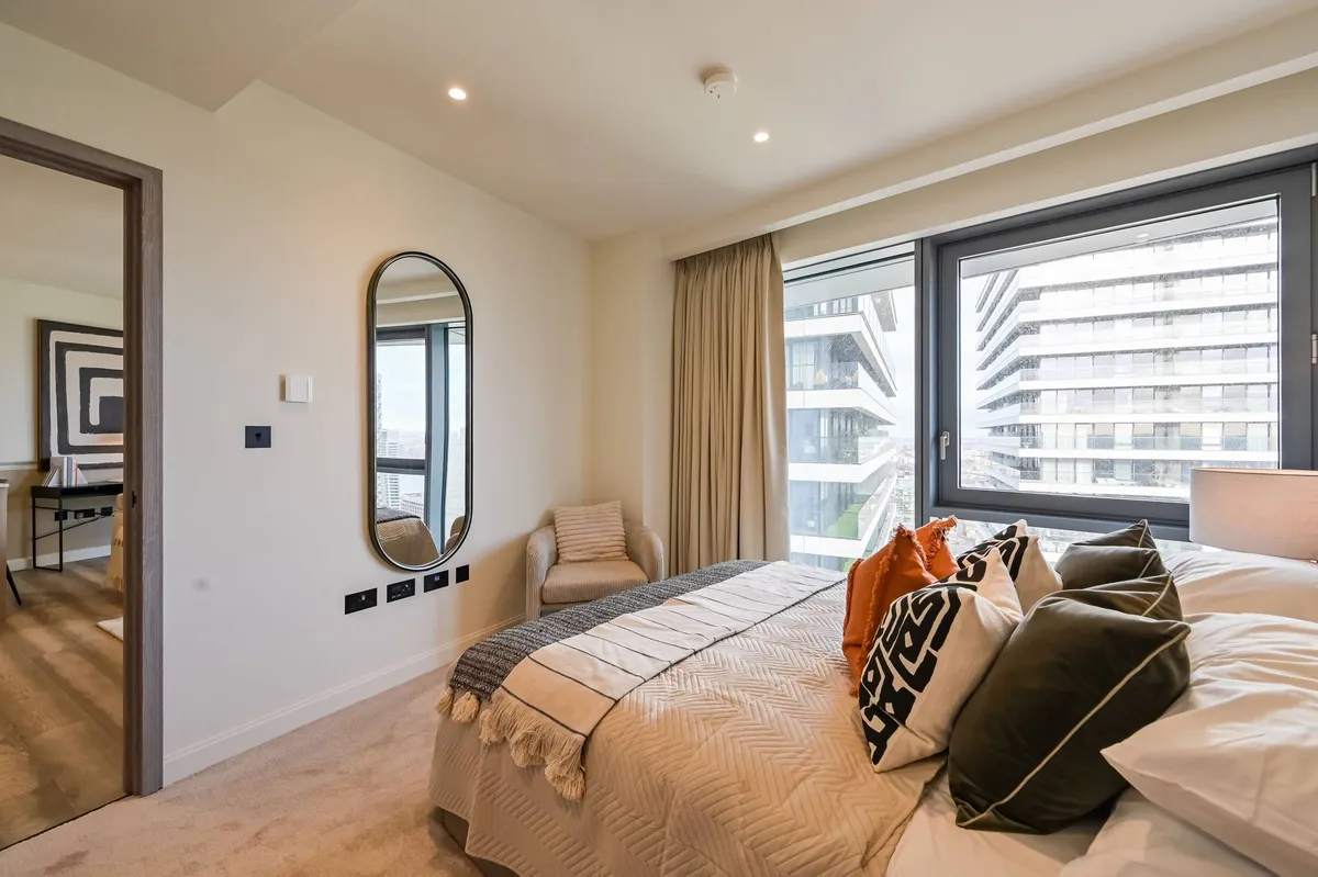The apartment features a beautifully designed open-plan living and dining area with floor-to-ceiling windows that fill the space with natural light while framing dramatic city views and sunsets. The living space flows seamlessly onto a private balcony, creating the perfect setting for relaxing or entertaining while enjoying the elevated outlook over London.