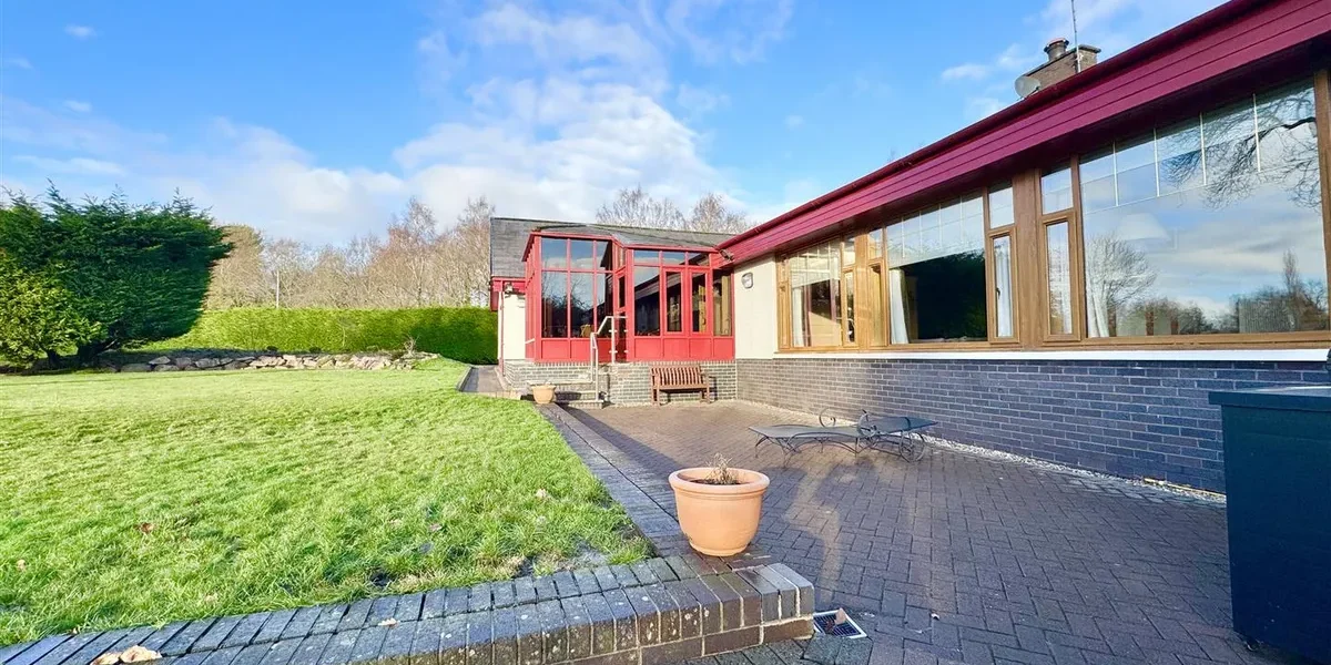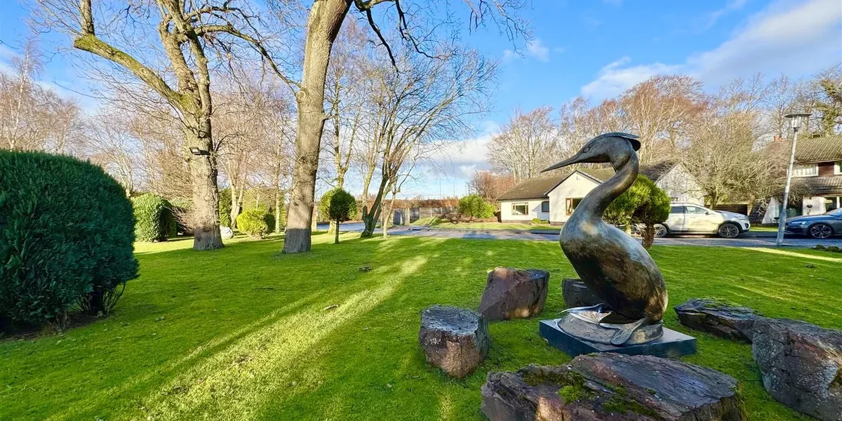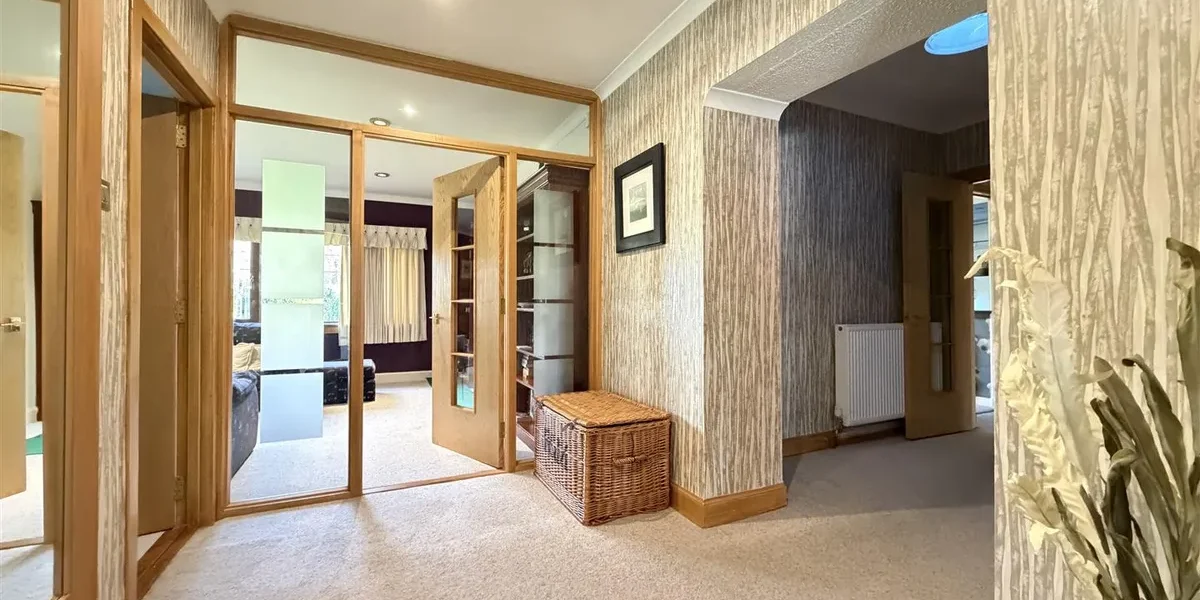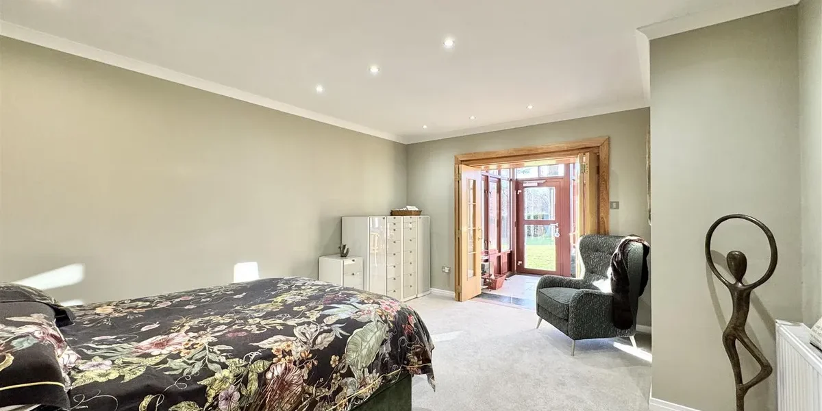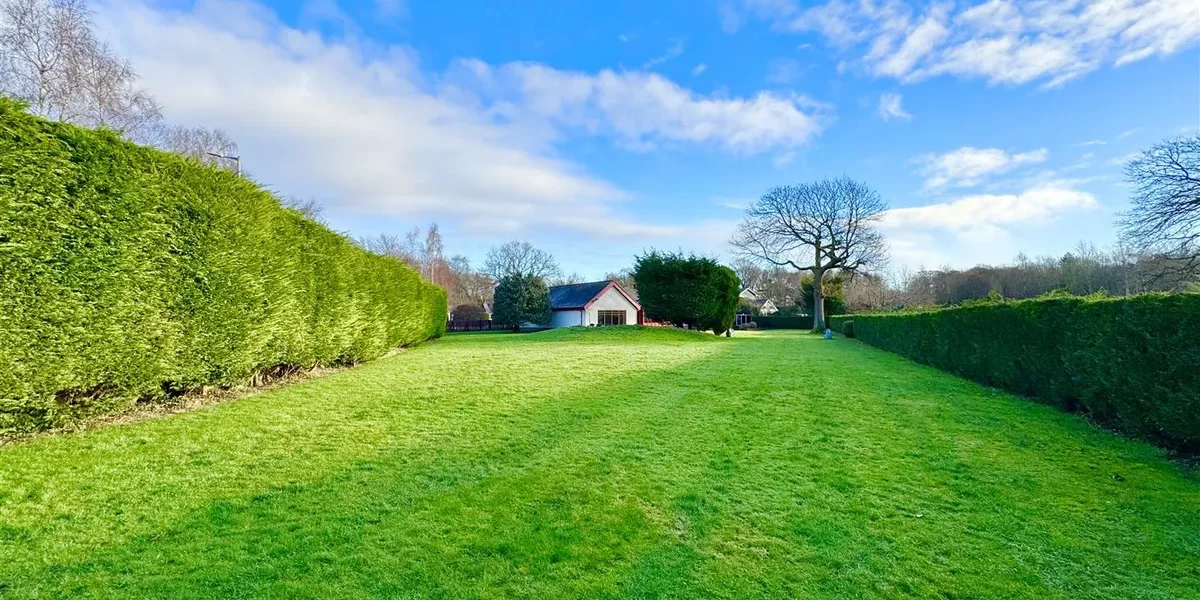The gardens are a standout feature – extensive, established and exceptionally private. They are predominantly laid to lawn with patio areas, mature trees and well-stocked planting. A large driveway provides parking for multiple vehicles and leads to two substantial garages, together offering potential for up to four cars.