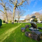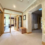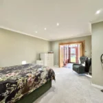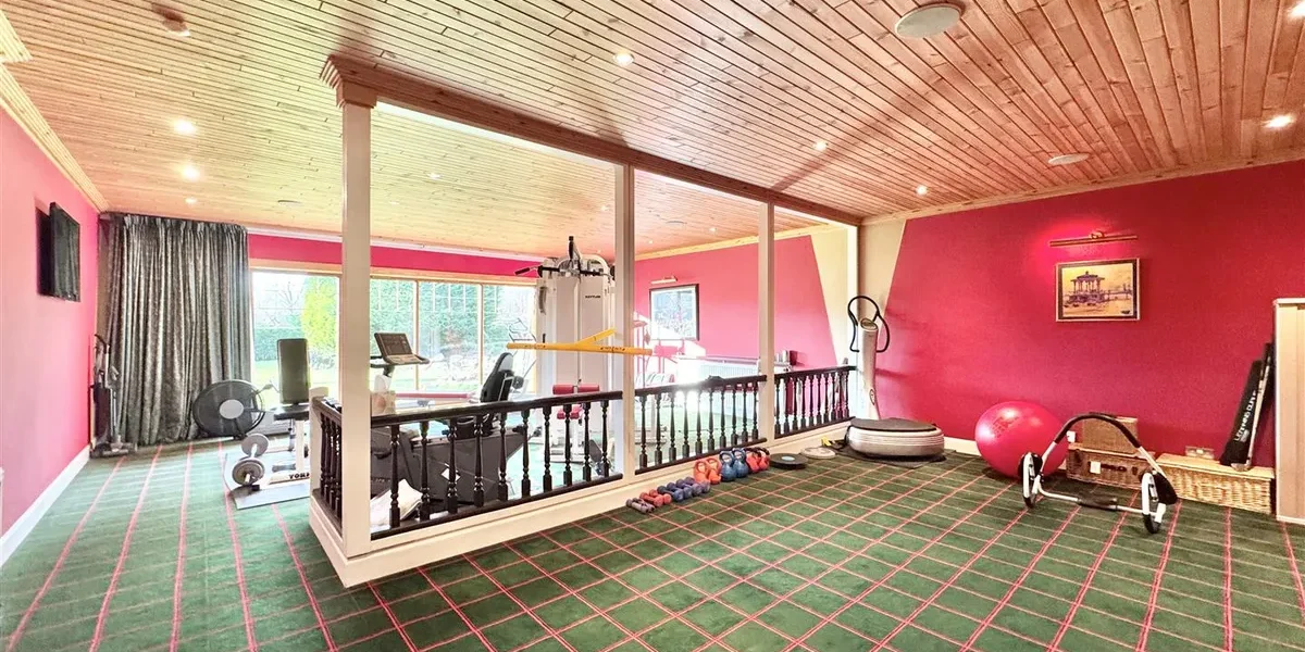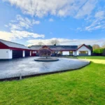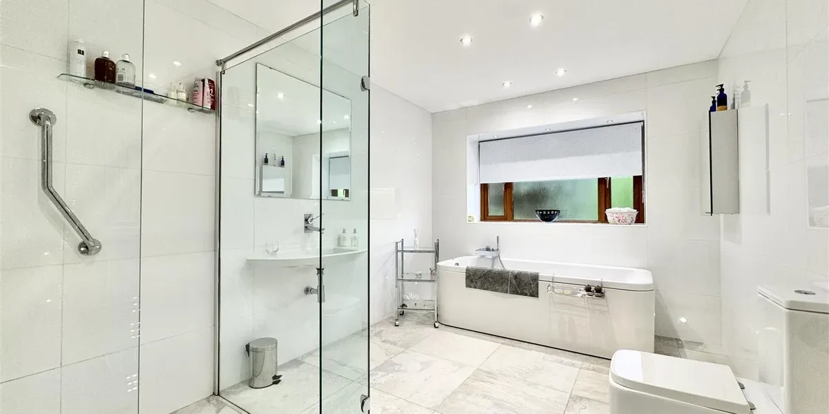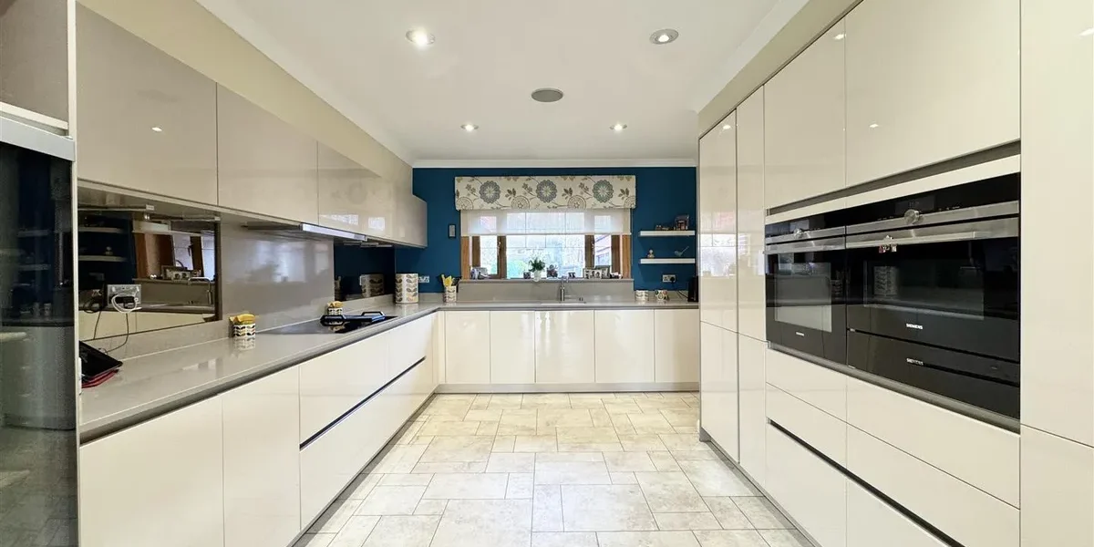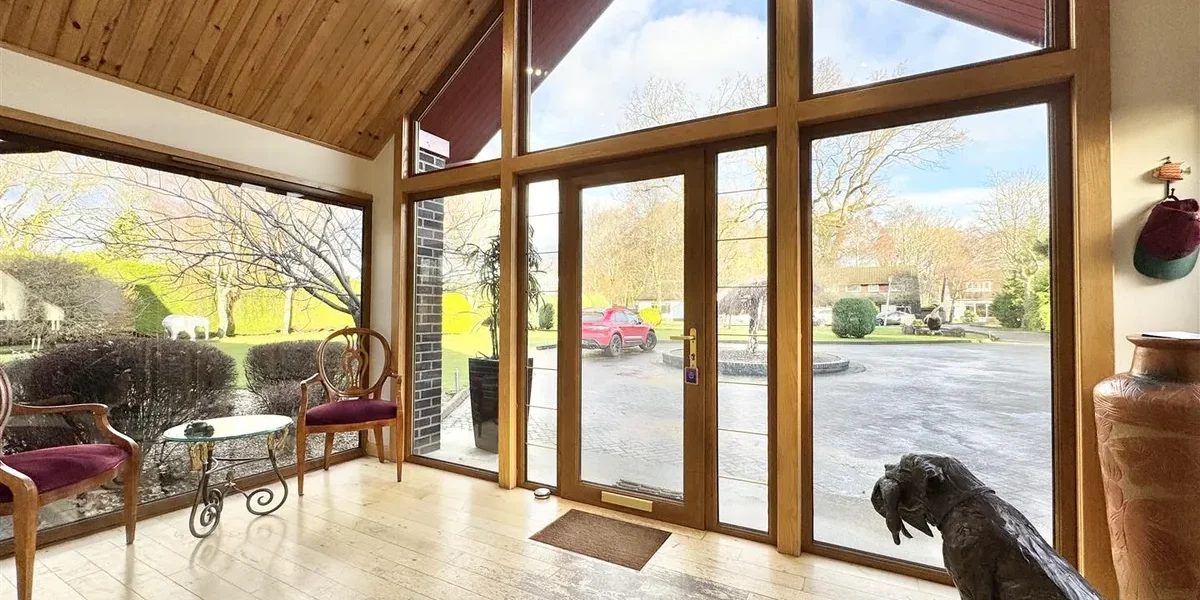 The gardens are a standout feature – extensive, established and exceptionally private. They are predominantly laid to lawn with patio areas, mature trees and well-stocked planting. A large driveway provides parking for multiple vehicles and leads to two substantial garages, together offering potential for up to four cars.