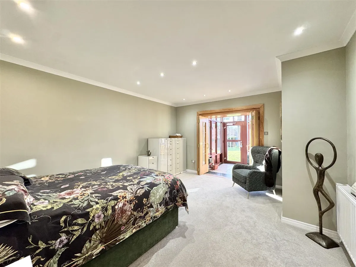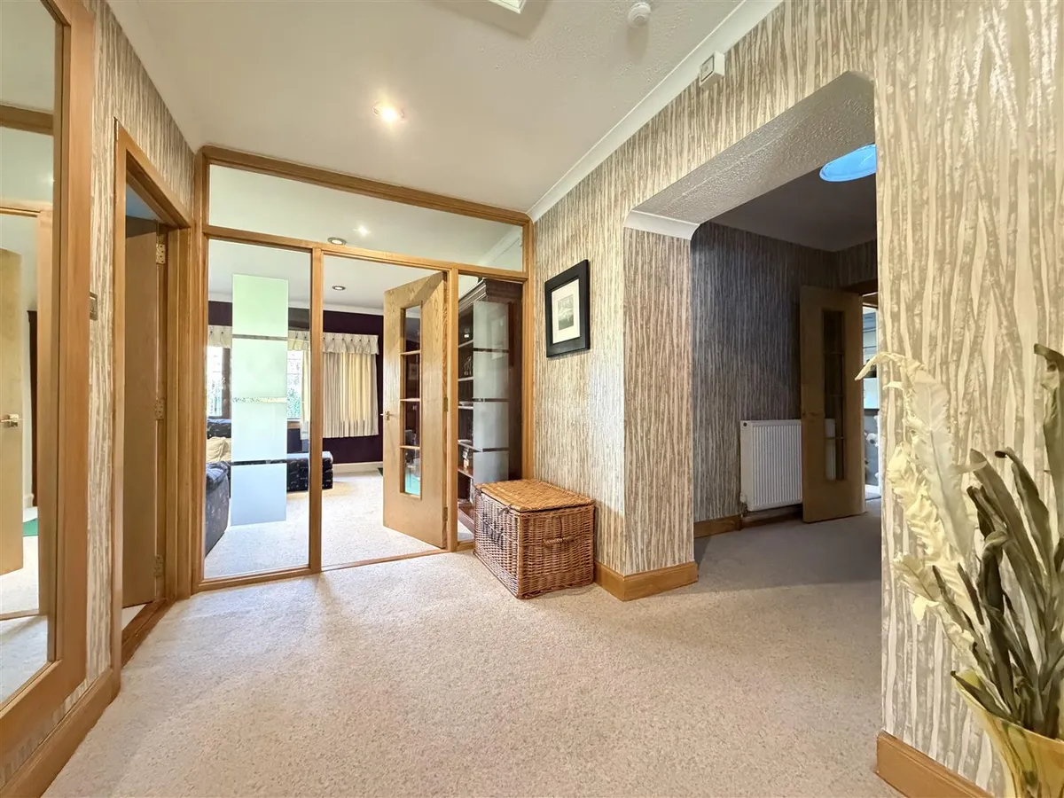 The gardens are a standout feature – extensive, established and exceptionally private. They are predominantly laid to lawn with patio areas, mature trees and well-stocked planting. A large driveway provides parking for multiple vehicles and leads to two substantial garages, together offering potential for up to four cars.